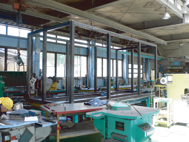 工場での本体フレ−ムの製作風景です。1ミリの誤差もなく、鉄骨を溶接していきます。